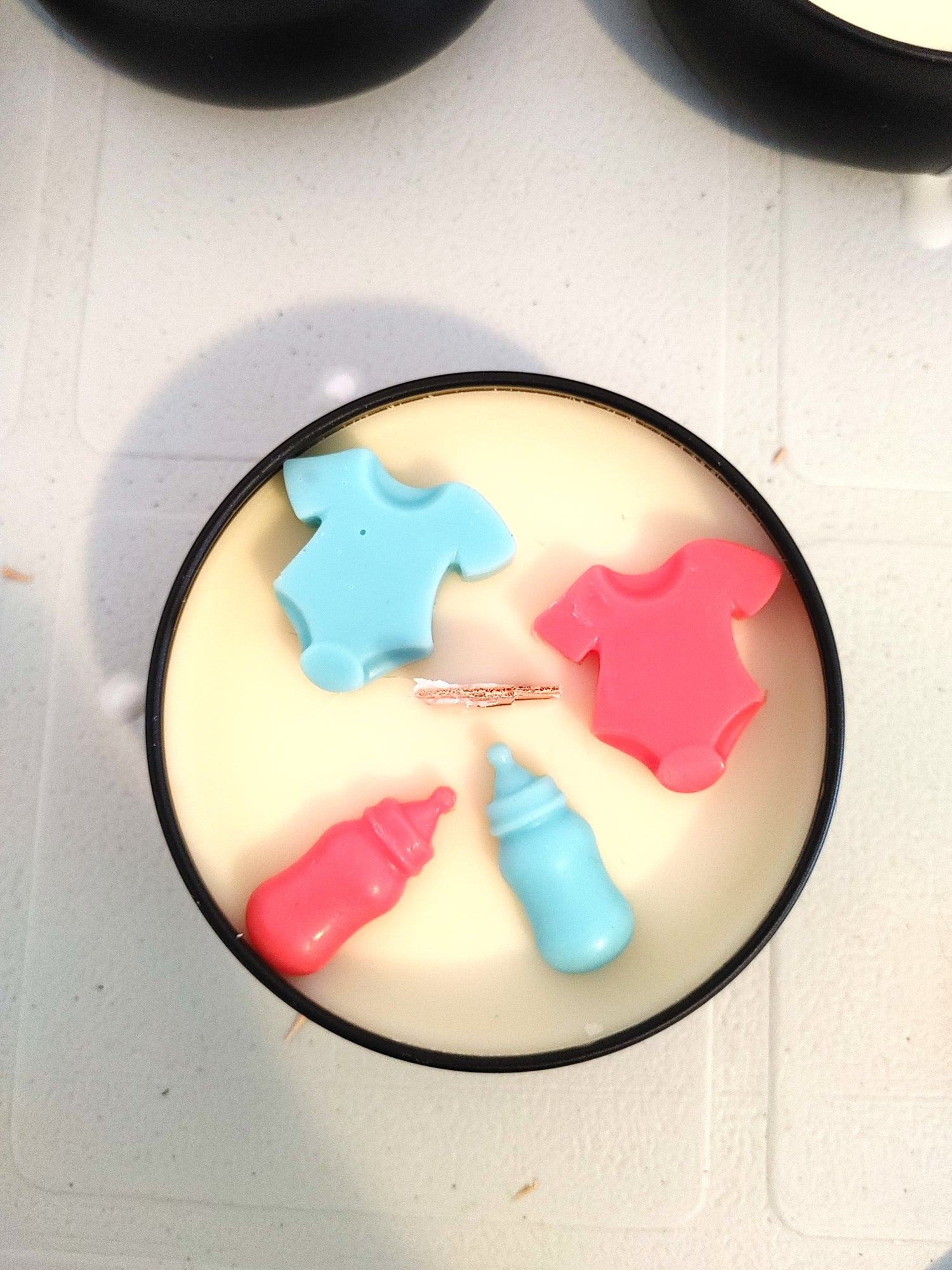 Celebrate baby through cute candle favours featuring wax imbeds of baby items.